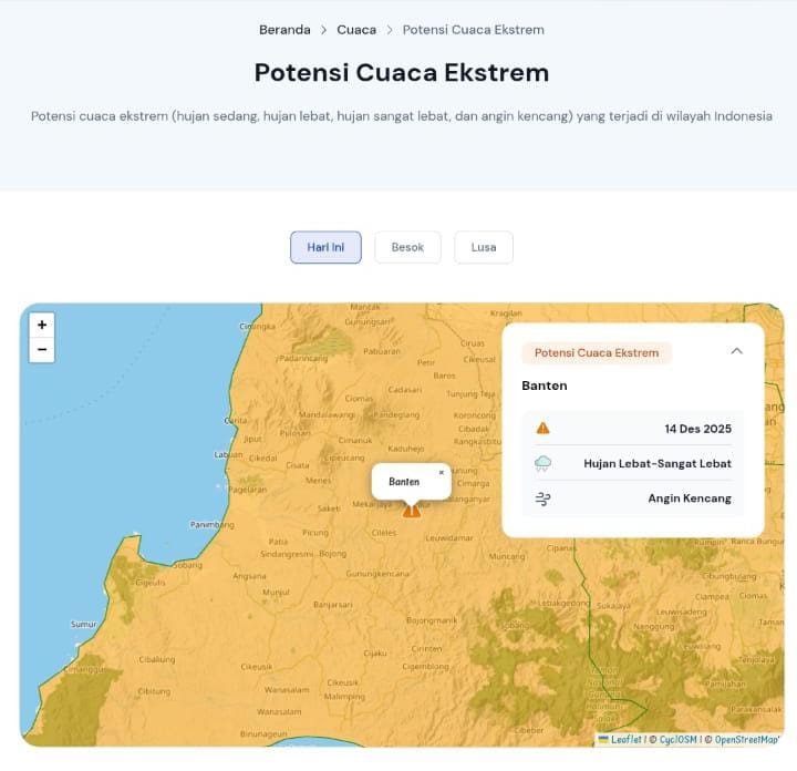 SERANG, RUBRIKBANTEN – Ancaman cuaca ekstrem kembali membayangi wilayah Provinsi Banten. Polda Banten mengeluarkan imbauan keras kepada masyarakat agar meningkatkan kewaspadaan menyusul prakiraan cuaca terbaru Badan Meteorologi, Klimatologi, dan Geofisika (BMKG) Banten, Minggu (14/12).