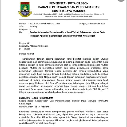 Surat dengan nomor 800.1.2.5/837/BKPSDM-C/2025 tertanggal 28 November 2025 itu dikirimkan seolah-olah kepada Kepala SMP Negeri 12 Cilegon. Dalam surat tersebut, pihak sekolah diminta melakukan koordinasi terkait mutasi guru dan pegawai kepada seseorang yang mengaku sebagai pejabat BKPSDM, lengkap dengan mencantumkan nama dan nomor kontak.