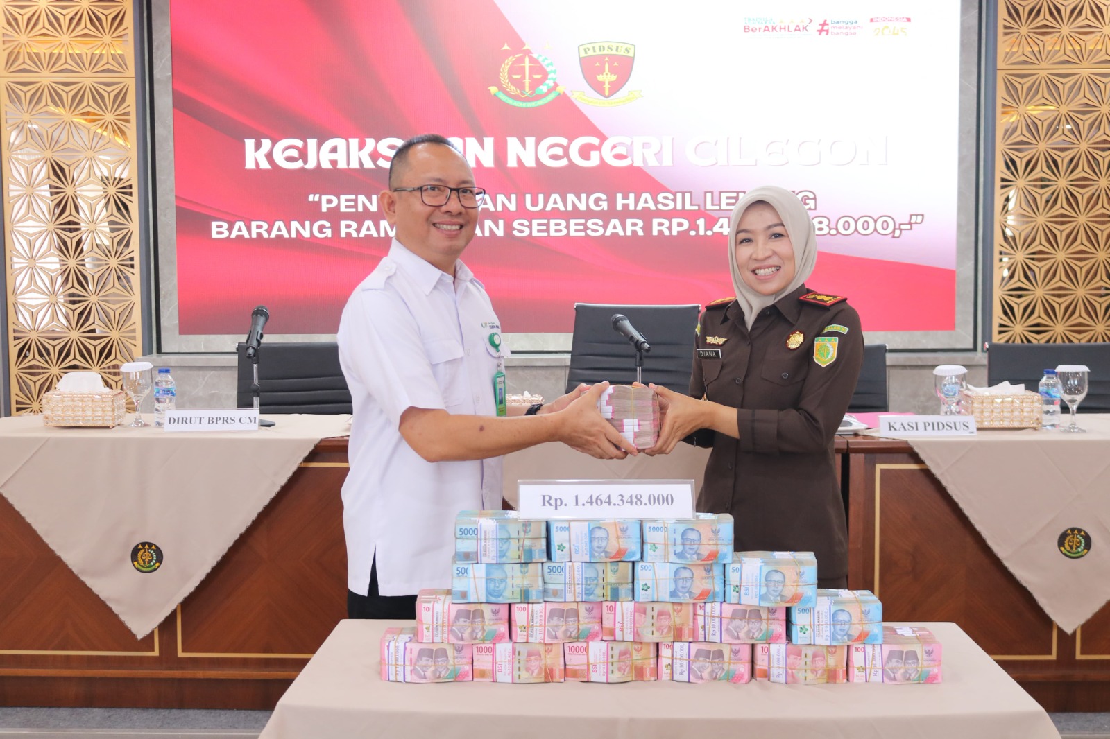Sebanyak Rp1.464.348.000,- (satu milyar empat ratus enam puluh empat juta tiga ratus empat puluh delapan ribu Rupiah) berhasil diperoleh dari hasil lelang barang rampasan. Uang tersebut diserahkan kepada Novran Erviatman Syarifuddin, SE, MM, selaku Direktur Utama BPRS Cilegon Mandiri.