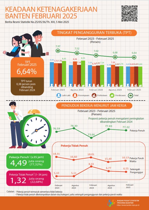 SERANG, RUBRIKBANTEN — Tingkat Pengangguran Terbuka (TPT) di Provinsi Banten mengalami penurunan signifikan. Berdasarkan Berita Resmi Statistik No. 25/05/36/Th. XIX yang dirilis Badan Pusat Statistik (BPS) Provinsi Banten pada 5 Mei 2025, TPT pada Februari 2025 tercatat sebesar 6,64 persen. Angka ini turun 0,38 persen poin dibandingkan Februari 2024 yang mencapai 7,02 persen.