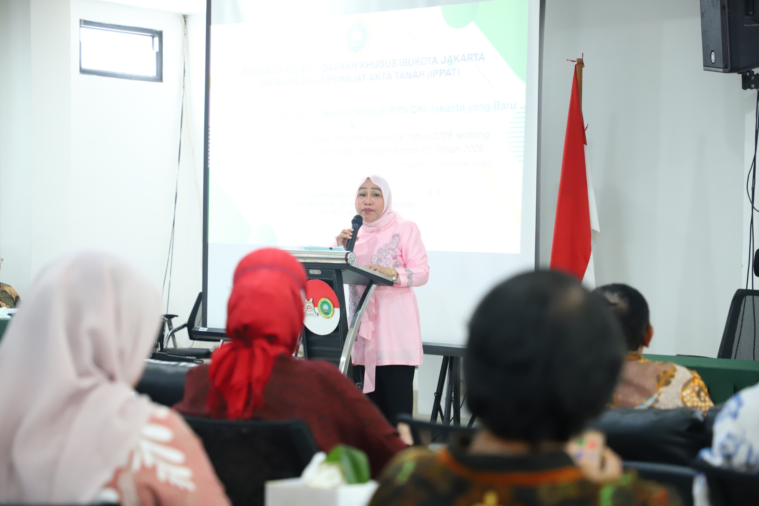 JAKARTA, RUBRIKBANTEN — Kepala Kantor Wilayah Badan Pertanahan Nasional (Kakanwil BPN) Provinsi DKI Jakarta, Erry Juliani Pasoreh, menghadiri acara silaturahmi bersama Pengurus Wilayah Ikatan Pejabat Pembuat Akta Tanah (Pengwil IPPAT) DKI Jakarta yang dirangkaikan dengan sosialisasi Peraturan Menteri Agraria dan Tata Ruang/Kepala BPN (Permen ATR/BPN) Nomor 9 Tahun 2025, Jumat (31/10/2025).