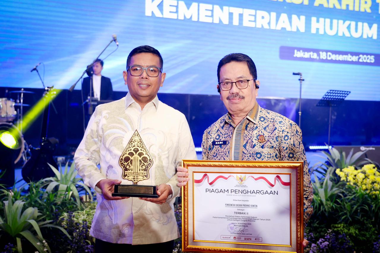 Penghargaan prestisius tersebut diserahkan langsung oleh Menteri Hukum RI, Supratman Andi Agtas, kepada Gubernur Banten Andra Soni dalam agenda Rapat Koordinasi Pengendalian Kinerja dan Refleksi Akhir Tahun Kementerian Hukum 2025 di Grand Mercure Kemayoran, Jakarta, Kamis (18/12/2025).